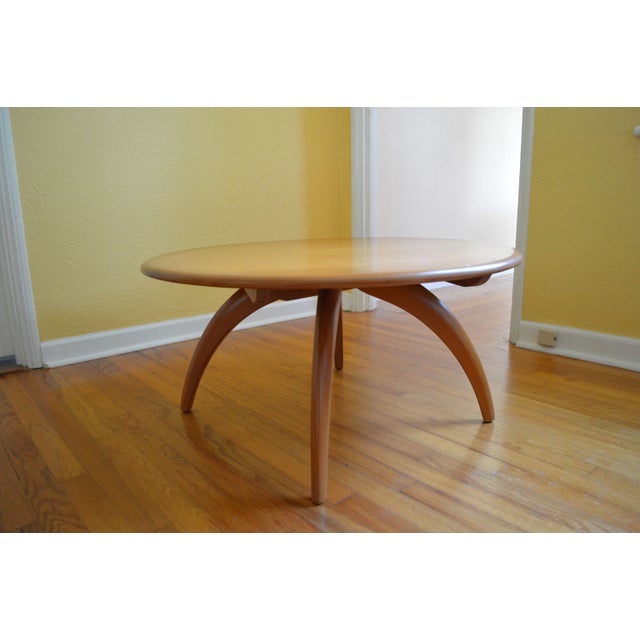 Heywood wakefield round coffee table 47w spider leg table mid century modern furniture blonde wood atomic danish modern scandinavian decor.